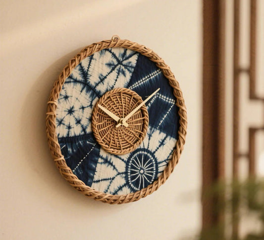 The Indigo Weave Clock blends the calm rhythm of rattan weaving with the timeless beauty of indigo dye art.